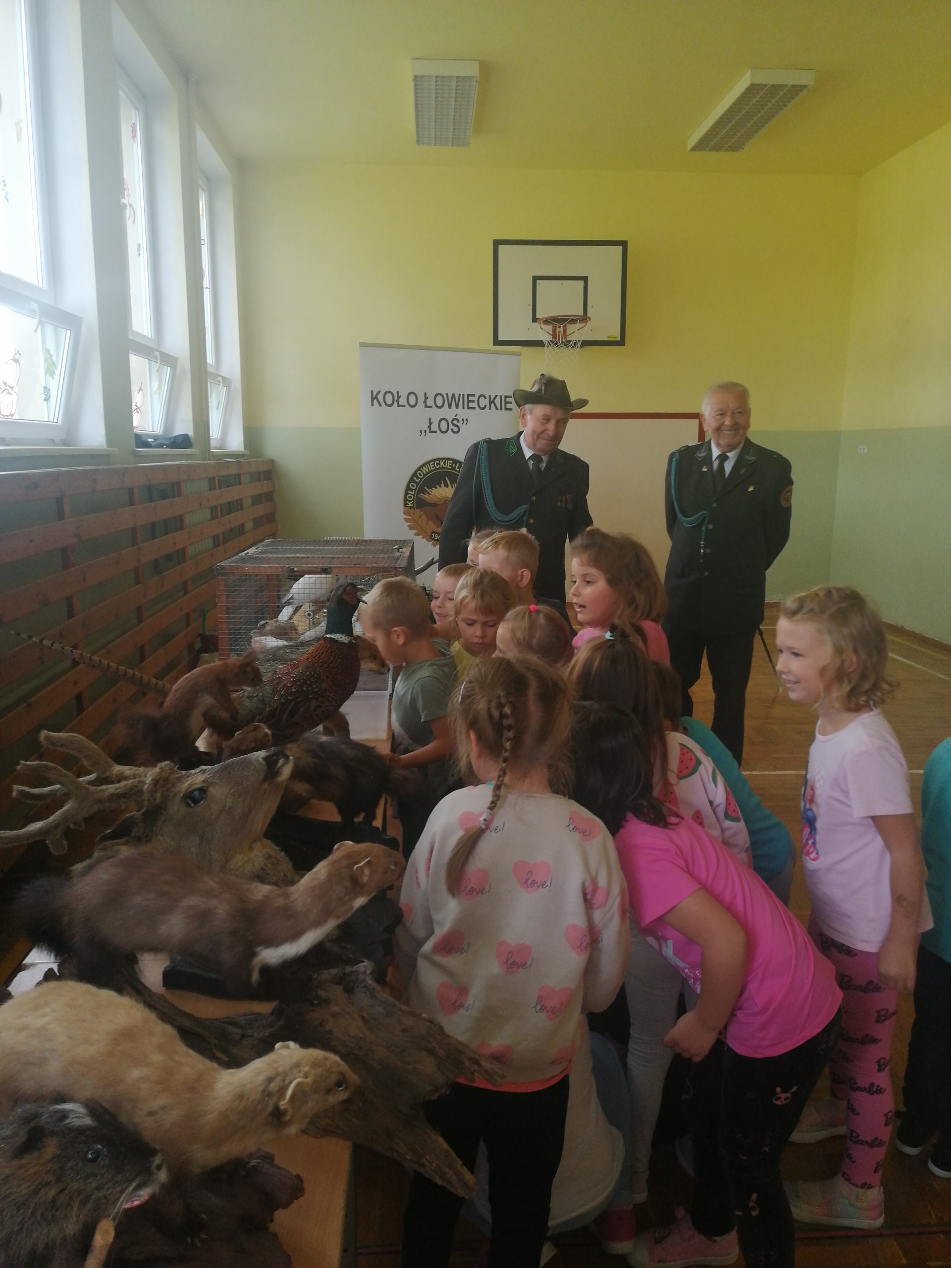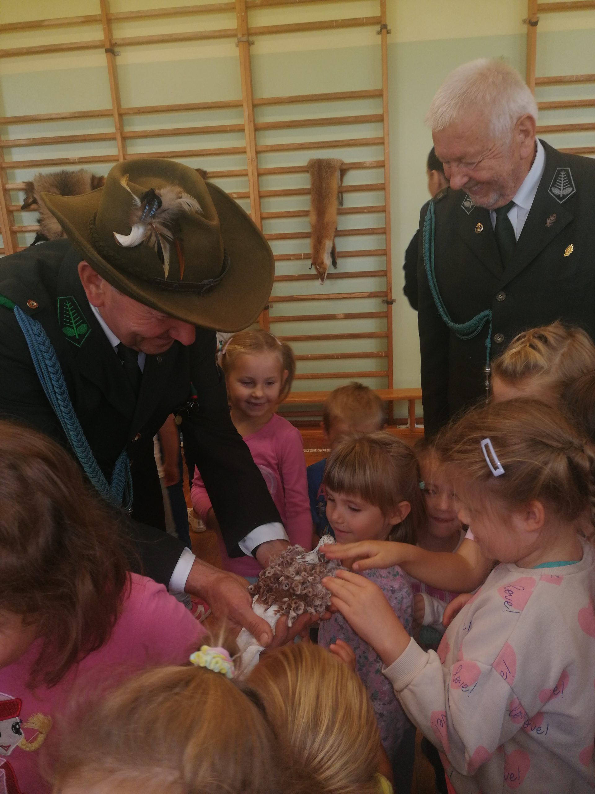 Podczas wizyty myśliwi, ubrani w galowe mundury, opowiedzieli dzieciom o swojej pasji – łowiectwie. Wyjaśnili, że do ich zadań należy m.in. utrzymanie równowagi populacji zwierząt, ochrona zwierzyny łownej i jej środowiska, dokarmianie, budowanie paśników, pozyskiwanie i magazynowanie karmy, a nawet walka z kłusownictwem. Panowie podzielili się ciekawostkami dotyczącymi życia zwierząt leśnych. Posługiwali się przy tym gwarą myśliwską. Dzieci z dużym zainteresowaniem słuchały barwnych opowieści, ale z jeszcze większym entuzjazmem oglądały trofea myśliwskie (parostki kozła sarny czy łopaty łosia), a także spreparowane zwierzęta (m.in. lisa, łasicę, norkę, bażanta, wiewiórkę, nutrię) i żywe okazy – króliki, żółwie, papużki, różne gatunki gołębi.