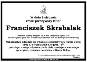 Msza Święta pogrzebowa odbędzie się w dniu 13 stycznia 2026 roku o godzinie 13:00 w Kościele parafialnym w Harcie Dolnej.